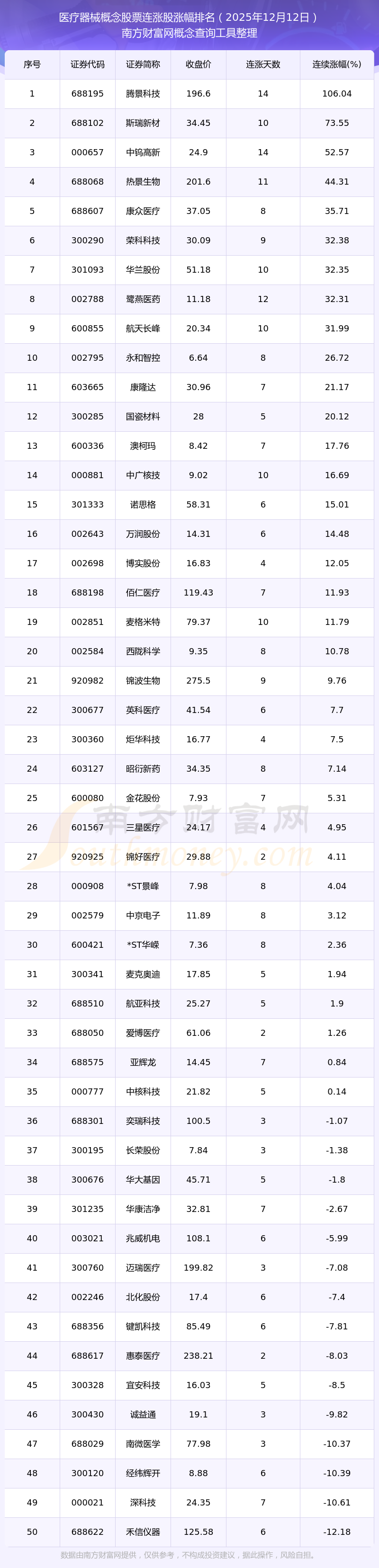 2025年12月12日醫(yī)療器械概念股票連漲股漲幅排名