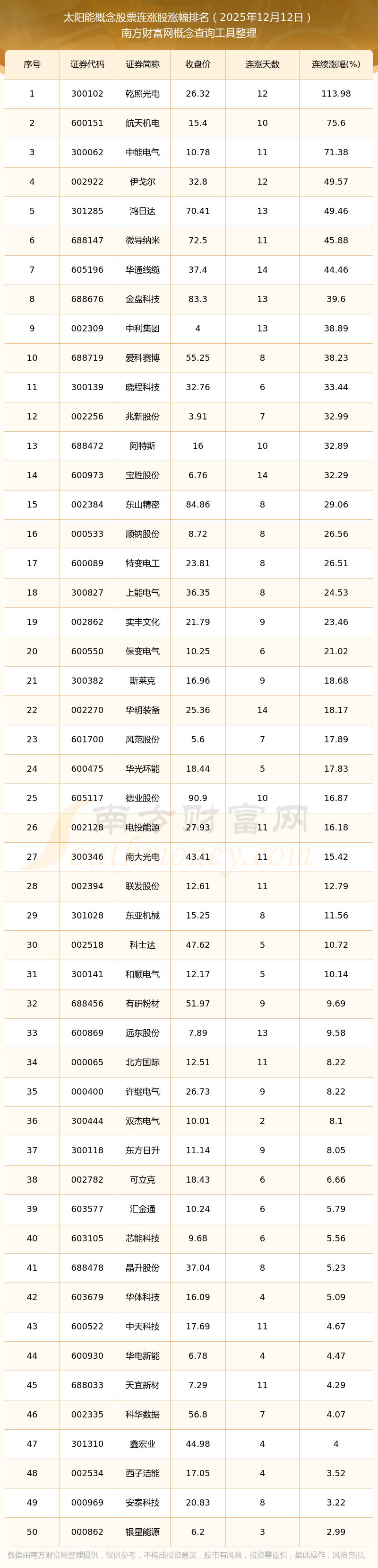 2025年12月12日太陽能概念股票連漲股漲幅排名
