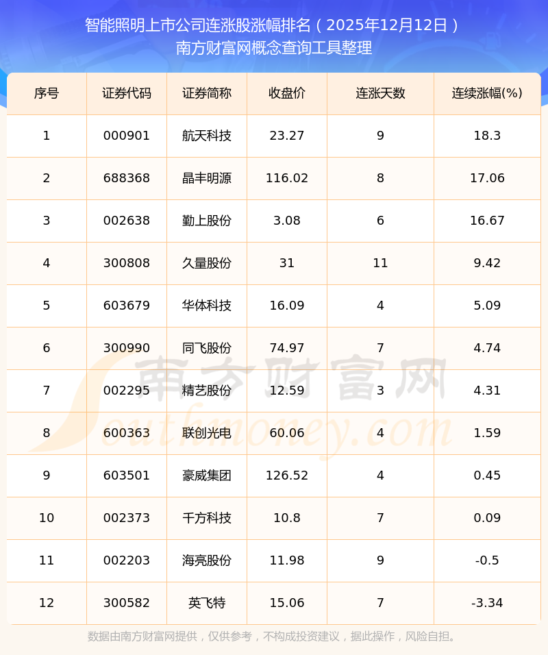 2025年12月12日智能照明上市公司連漲股漲幅排名