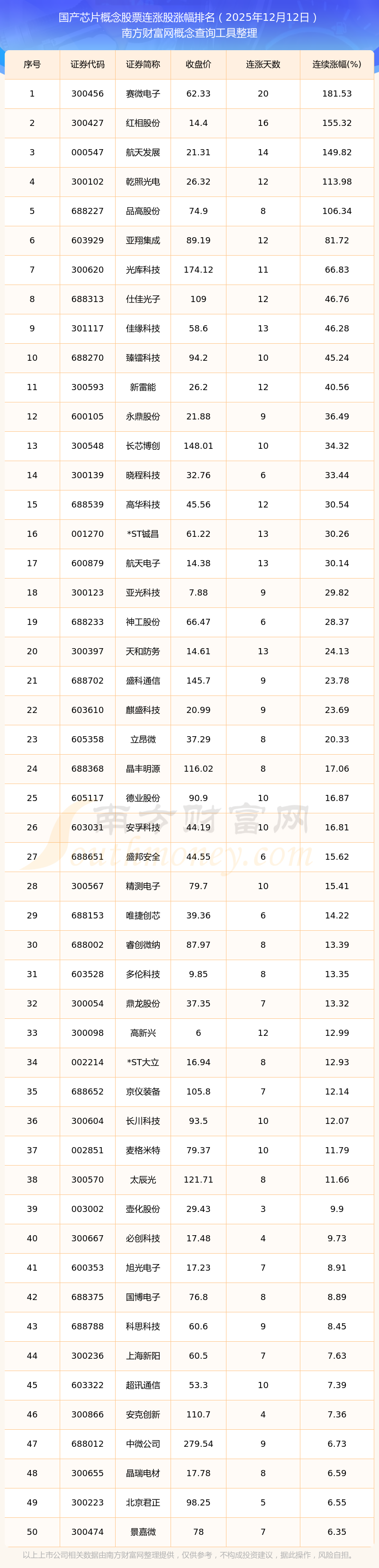 2025年12月12日國(guó)產(chǎn)芯片概念股票連漲股漲幅排名