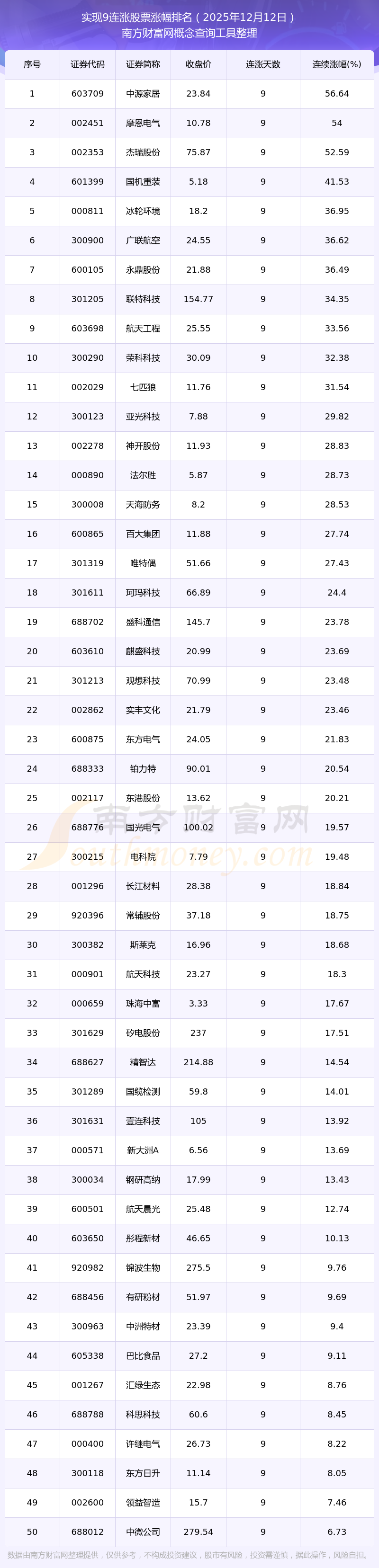 根據(jù)南方財(cái)富網(wǎng)概念查詢工具數(shù)據(jù)統(tǒng)計(jì),截止2025年12月12日收盤,共有74只個(gè)股實(shí)現(xiàn)9天連漲。其中連續(xù)漲幅較大的個(gè)股有中源家居、摩恩電氣、杰瑞股份等,連續(xù)漲幅分別為56.64%、54.00%、52.59%。