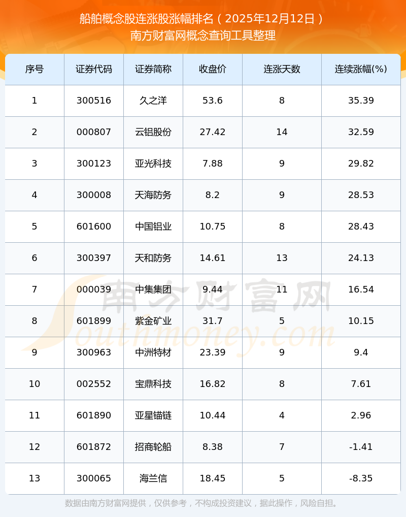 根據(jù)南方財(cái)富網(wǎng)概念查詢(xún)工具數(shù)據(jù)統(tǒng)計(jì),截止2025年12月12日收盤(pán),船舶概念股共有13只個(gè)股實(shí)現(xiàn)連漲。其中連續(xù)漲幅較大的個(gè)股有久之洋、云鋁股份、亞光科技等,連續(xù)漲幅分別為35.39%、32.59%、29.82%。