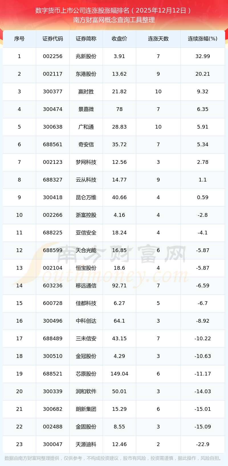 2025年12月12日數(shù)字貨幣上市公司連漲股漲幅排名