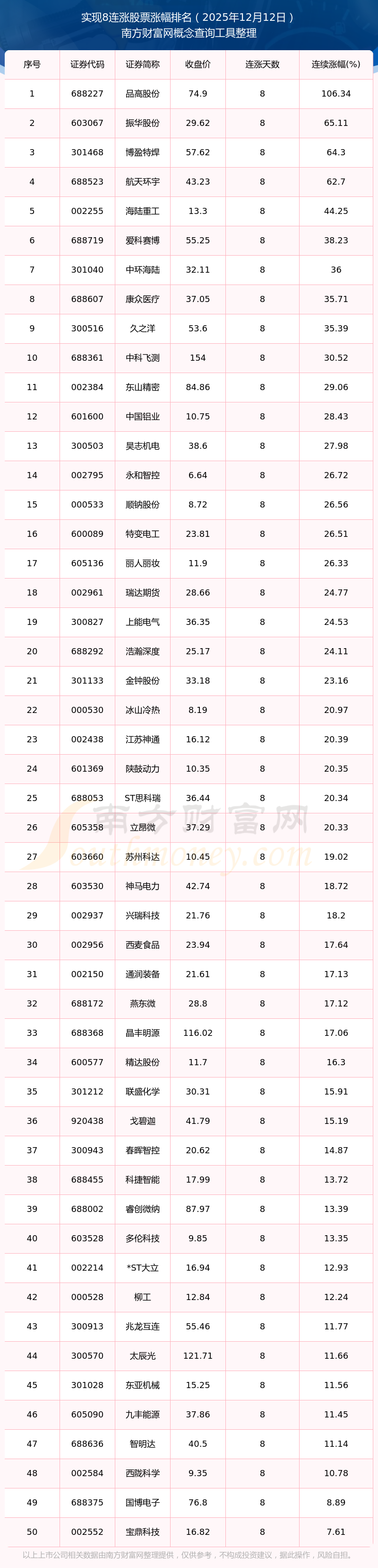 2025年12月12日實現(xiàn)8連漲股票漲幅排名