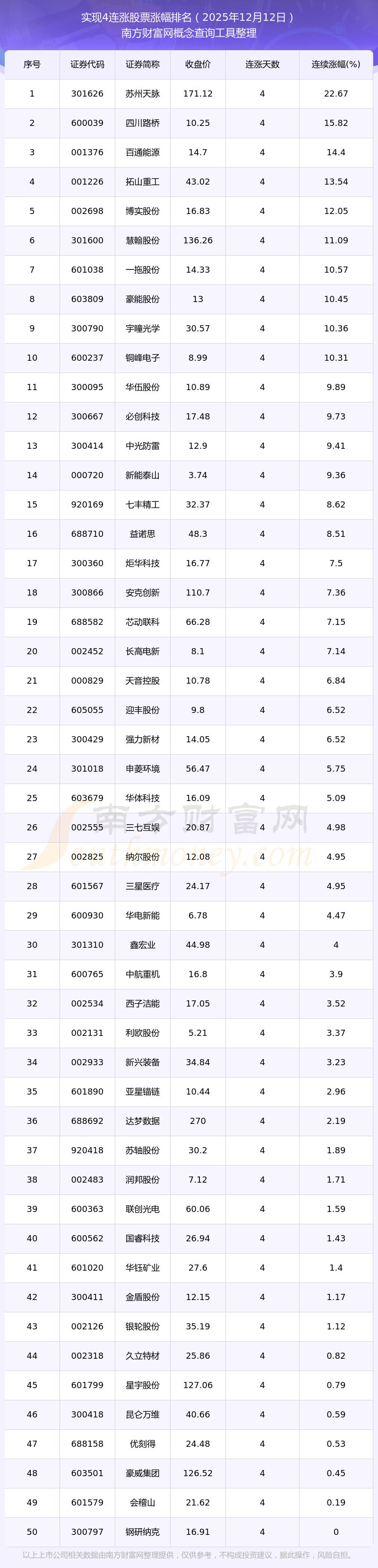 根據(jù)南方財(cái)富網(wǎng)概念查詢工具數(shù)據(jù)統(tǒng)計(jì),截止2025年12月12日收盤,共有113只個(gè)股實(shí)現(xiàn)4天連漲。其中連續(xù)漲幅較大的個(gè)股有蘇州天脈、四川路橋、百通能源等,連續(xù)漲幅分別為22.67%、15.82%、14.40%。