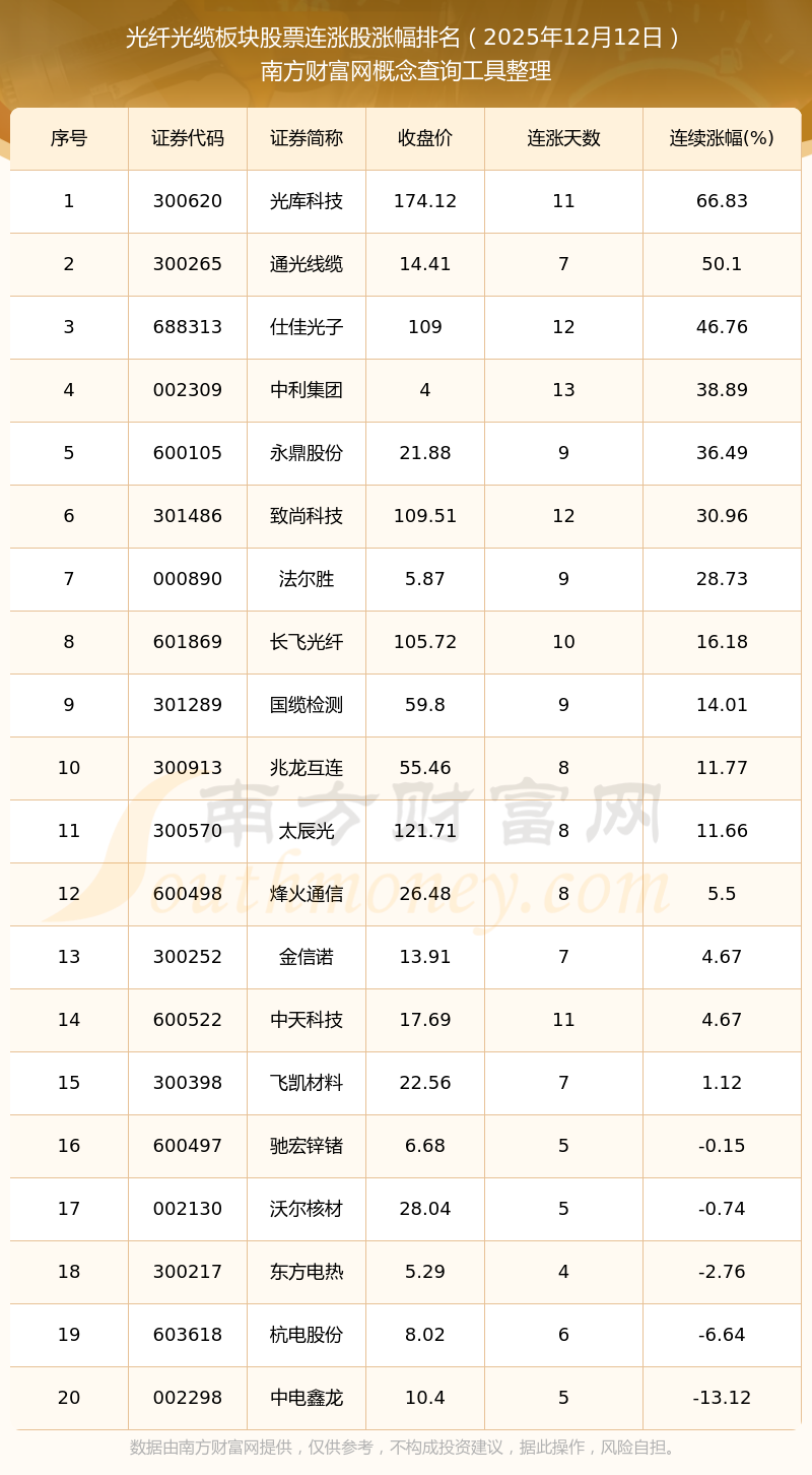 2025年12月12日光纖光纜板塊股票連漲股漲幅排名