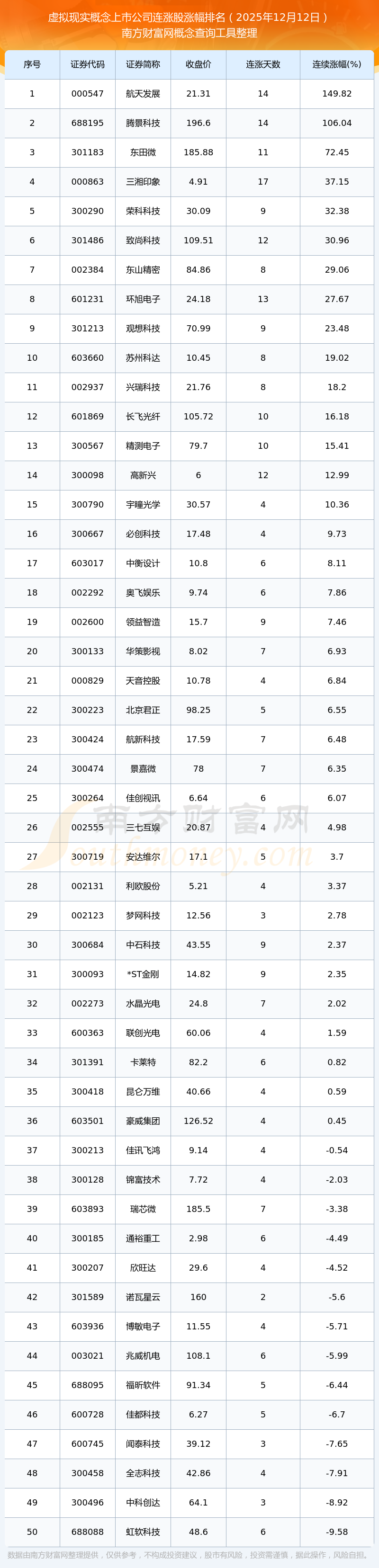 2025年12月12日虛擬現(xiàn)實概念上市公司連漲股漲幅排名