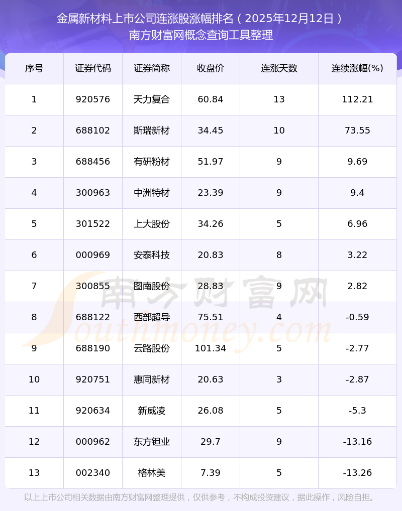 2025年12月12日金屬新材料上市公司連漲股漲幅排名