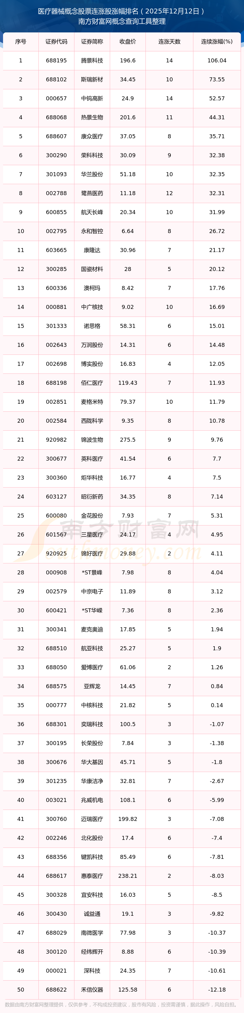 2025年12月12日醫(yī)療器械概念股票連漲股漲幅排名