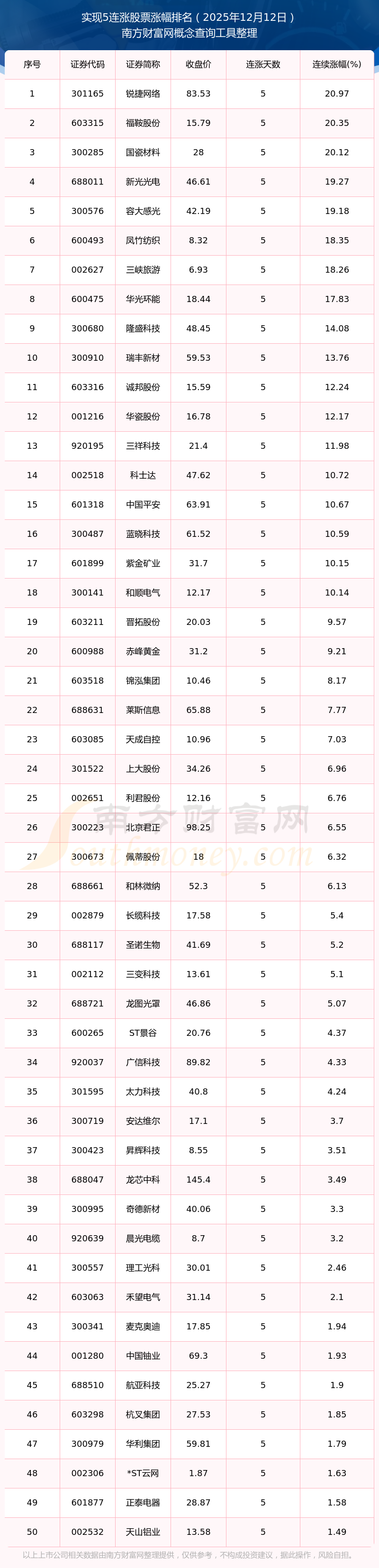 2025年12月12日實(shí)現(xiàn)5連漲股票漲幅排名