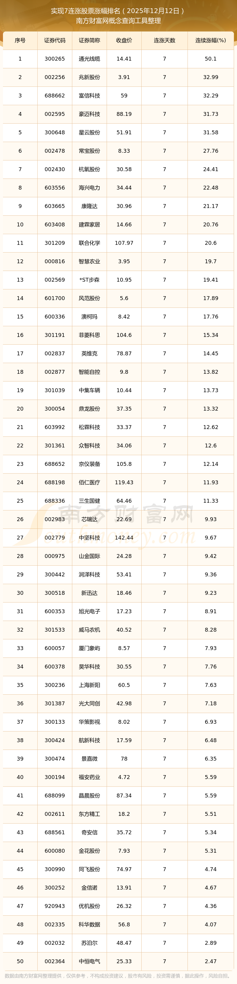 2025年12月12日實(shí)現(xiàn)7連漲股票漲幅排名