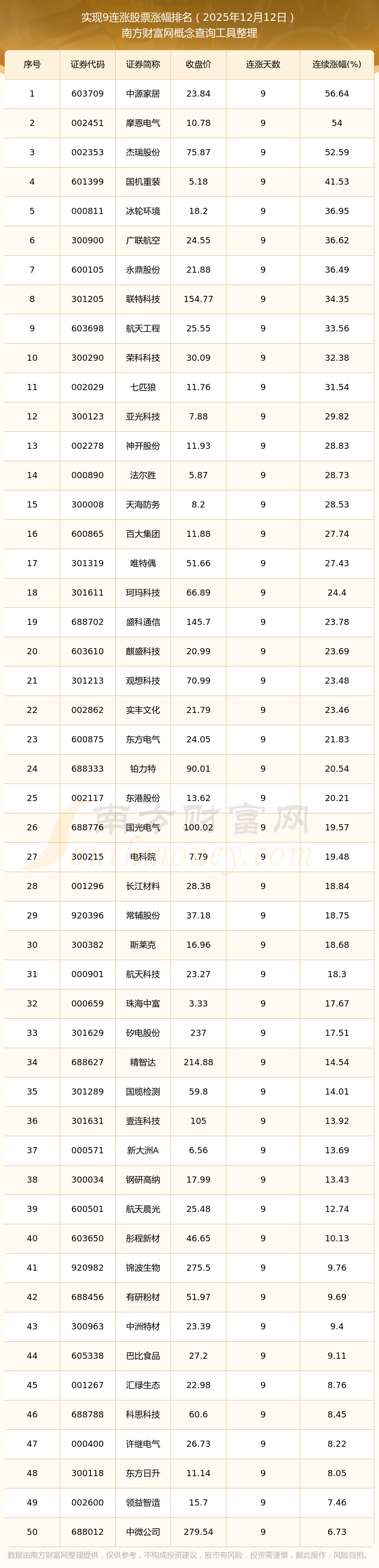 根據(jù)南方財(cái)富網(wǎng)概念查詢(xún)工具數(shù)據(jù)統(tǒng)計(jì),截止2025年12月12日收盤(pán),共有74只個(gè)股實(shí)現(xiàn)9天連漲。其中連續(xù)漲幅較大的個(gè)股有中源家居、摩恩電氣、杰瑞股份等,連續(xù)漲幅分別為56.64%、54.00%、52.59%。