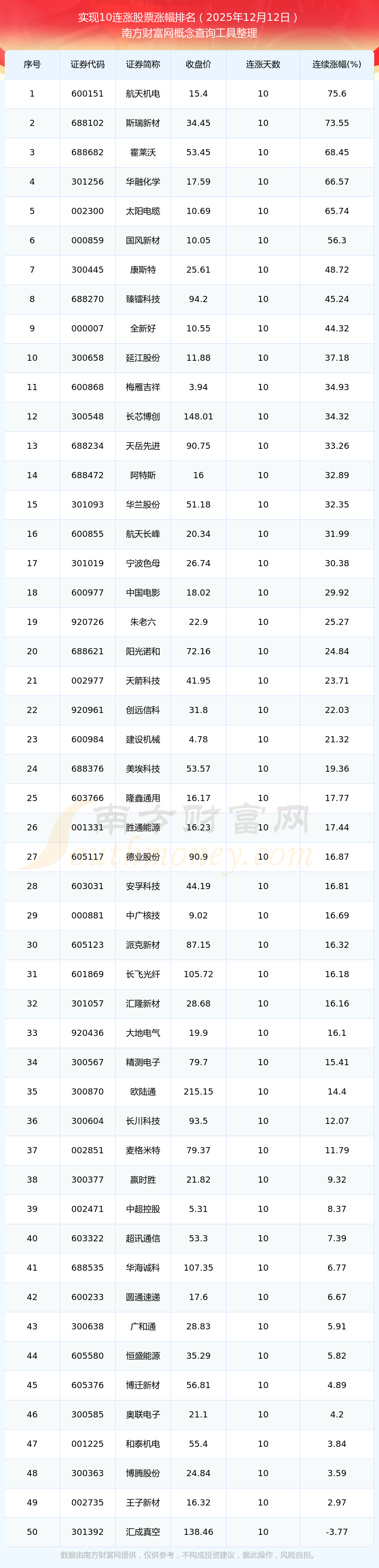 根據(jù)南方財(cái)富網(wǎng)概念查詢工具數(shù)據(jù)統(tǒng)計(jì),截止2025年12月12日收盤,共有55只個(gè)股實(shí)現(xiàn)10天連漲。其中連續(xù)漲幅較大的個(gè)股有航天機(jī)電、斯瑞新材、霍萊沃等,連續(xù)漲幅分別為75.60%、73.55%、68.45%。