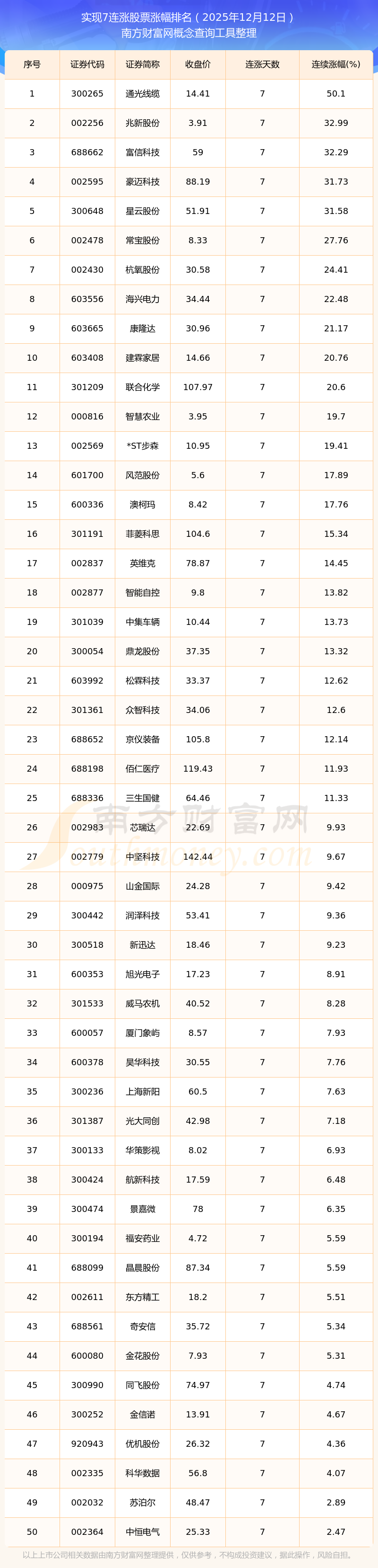 2025年12月12日實現(xiàn)7連漲股票漲幅排名