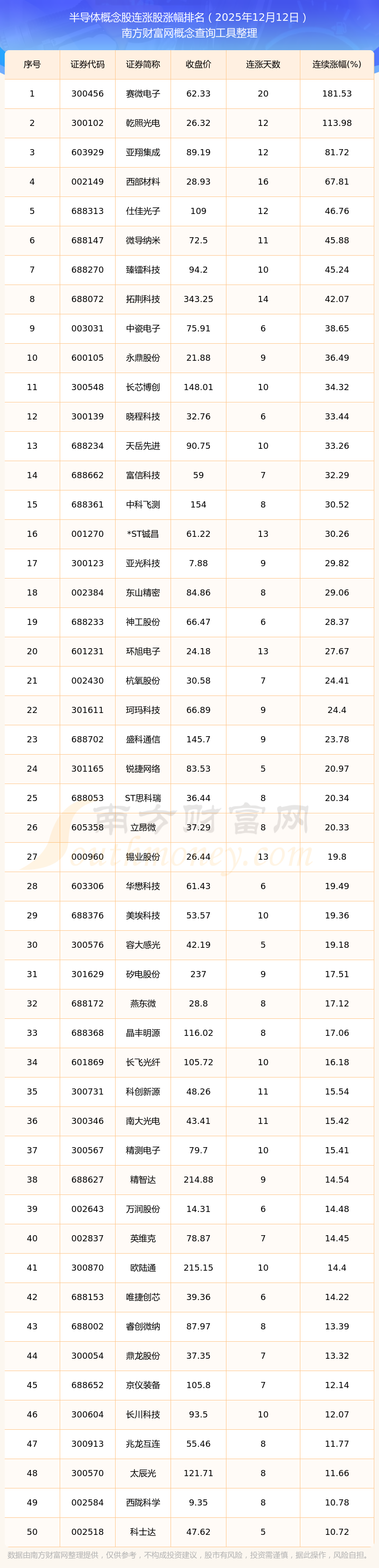 根據(jù)南方財富網(wǎng)概念查詢工具數(shù)據(jù)統(tǒng)計,截止2025年12月12日收盤,半導體概念股共有160只個股實現(xiàn)連漲。其中連續(xù)漲幅較大的個股有賽微電子、乾照光電、亞翔集成等,連續(xù)漲幅分別為181.53%、113.98%、81.72%。