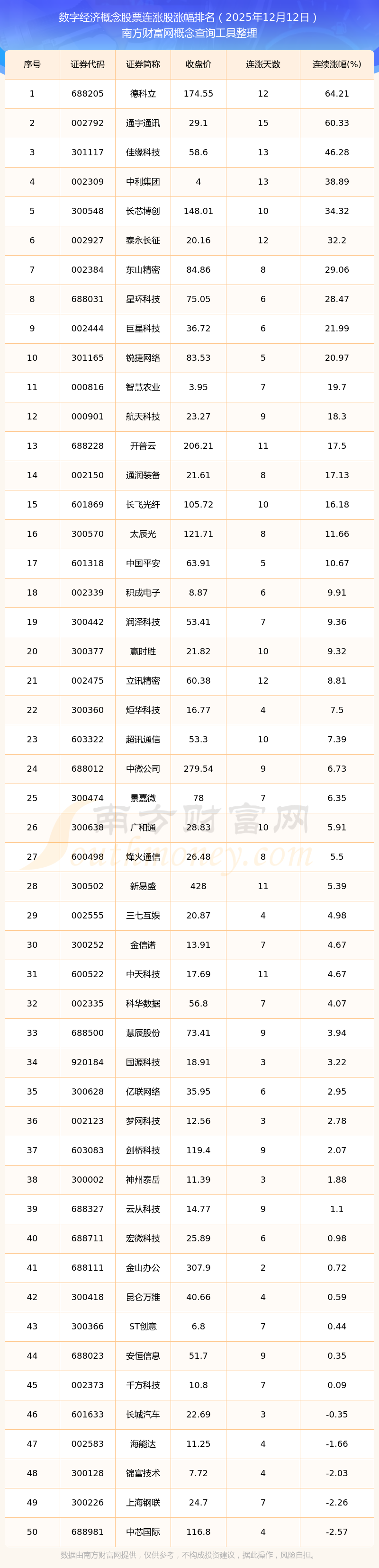 2025年12月12日數(shù)字經(jīng)濟(jì)概念股票連漲股漲幅排名
