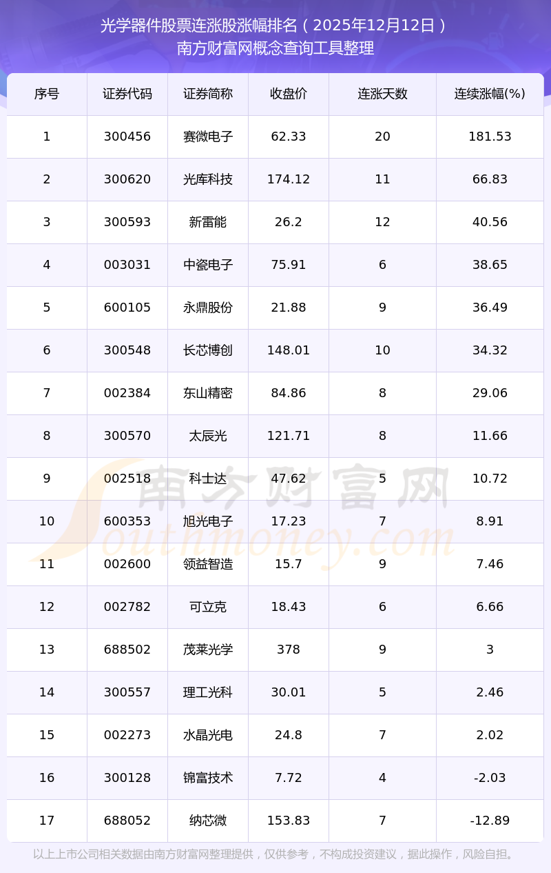 2025年12月12日光學(xué)器件股票連漲股漲幅排名