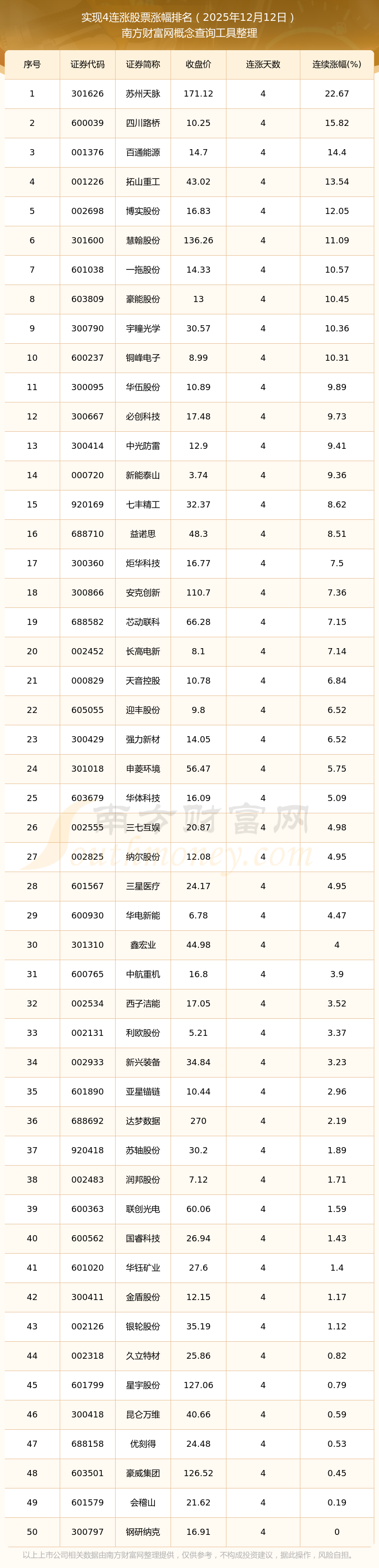 2025年12月12日實(shí)現(xiàn)4連漲股票漲幅排名