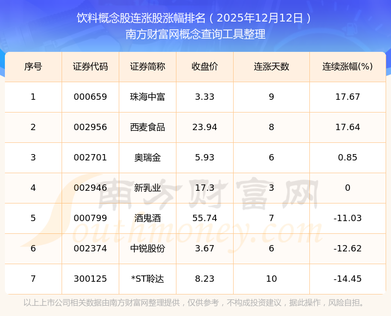 根據(jù)南方財(cái)富網(wǎng)概念查詢工具數(shù)據(jù)統(tǒng)計(jì),截止2025年12月12日收盤,飲料概念股共有7只個(gè)股實(shí)現(xiàn)連漲。其中連續(xù)漲幅較大的個(gè)股有珠海中富、西麥?zhǔn)称贰W瑞金等,連續(xù)漲幅分別為17.67%、17.64%、0.85%。