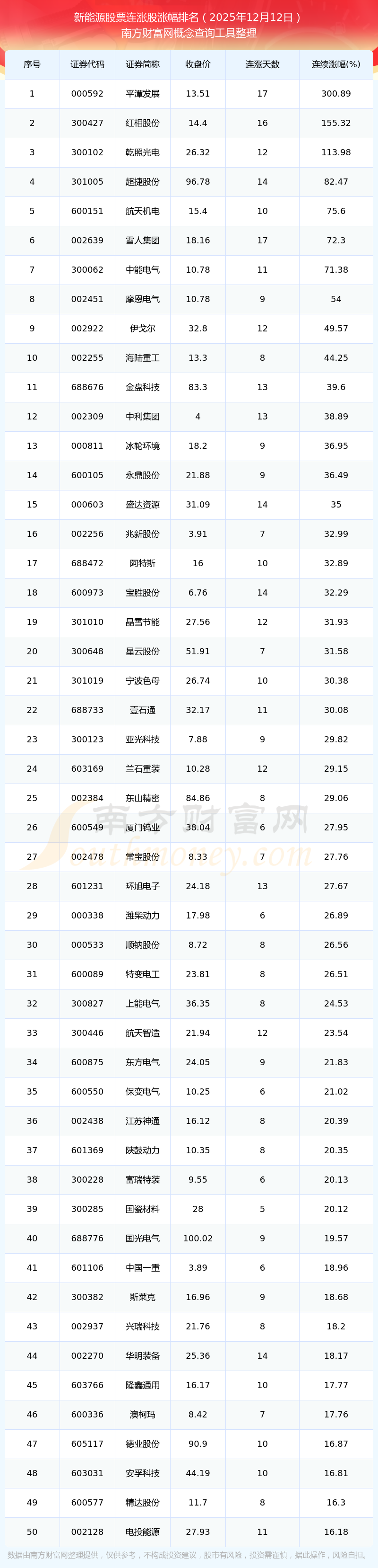 根據(jù)南方財富網(wǎng)概念查詢工具數(shù)據(jù)統(tǒng)計,截止2025年12月12日收盤,新能源股票共有195只個股實現(xiàn)連漲。其中連續(xù)漲幅較大的個股有平潭發(fā)展、紅相股份、乾照光電等,連續(xù)漲幅分別為300.89%、155.32%、113.98%。