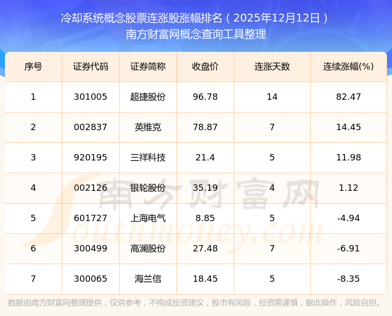 2025年12月12日冷卻系統(tǒng)概念股票連漲股漲幅排名