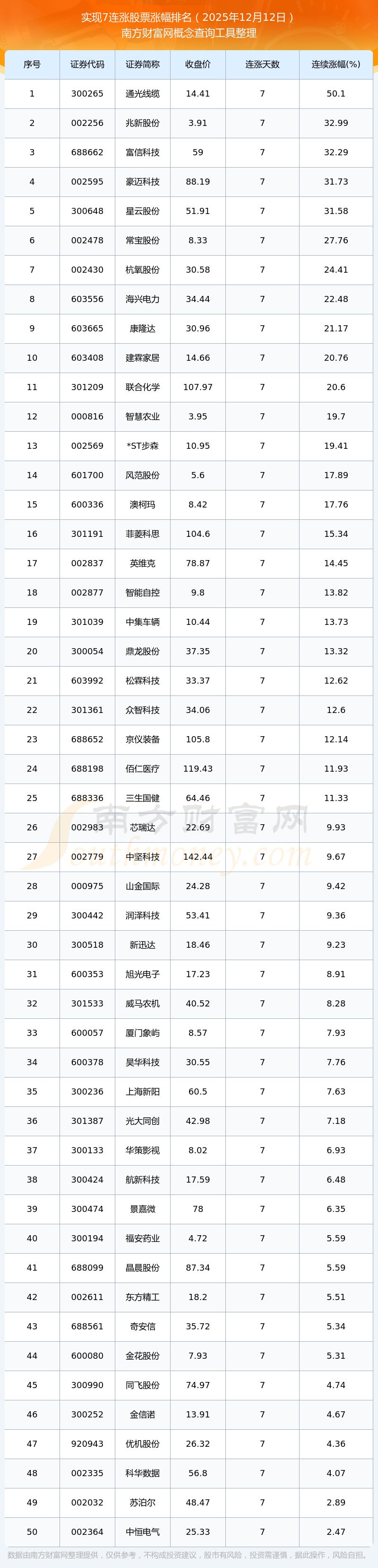 根據南方財富網概念查詢工具數據統(tǒng)計,截止2025年12月12日收盤,共有88只個股實現7天連漲。其中連續(xù)漲幅較大的個股有通光線纜、兆新股份、富信科技等,連續(xù)漲幅分別為50.10%、32.99%、32.29%。