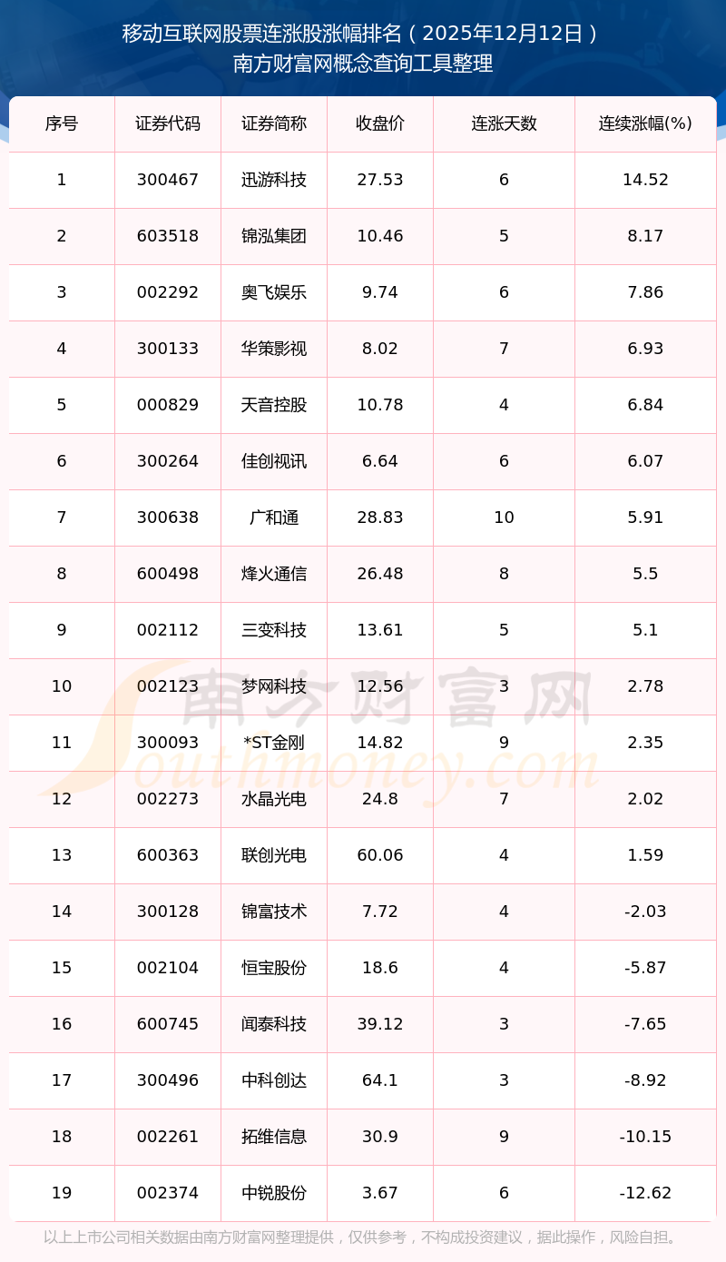 2025年12月12日移動(dòng)互聯(lián)網(wǎng)股票連漲股漲幅排名