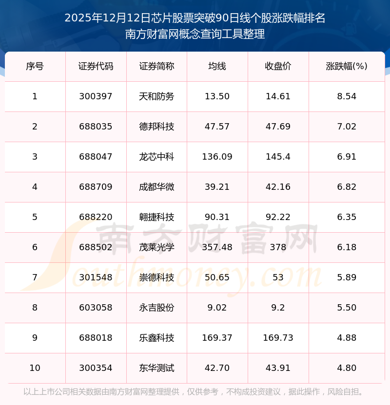 2025年12月12日芯片股票突破90日線個股漲跌幅排名