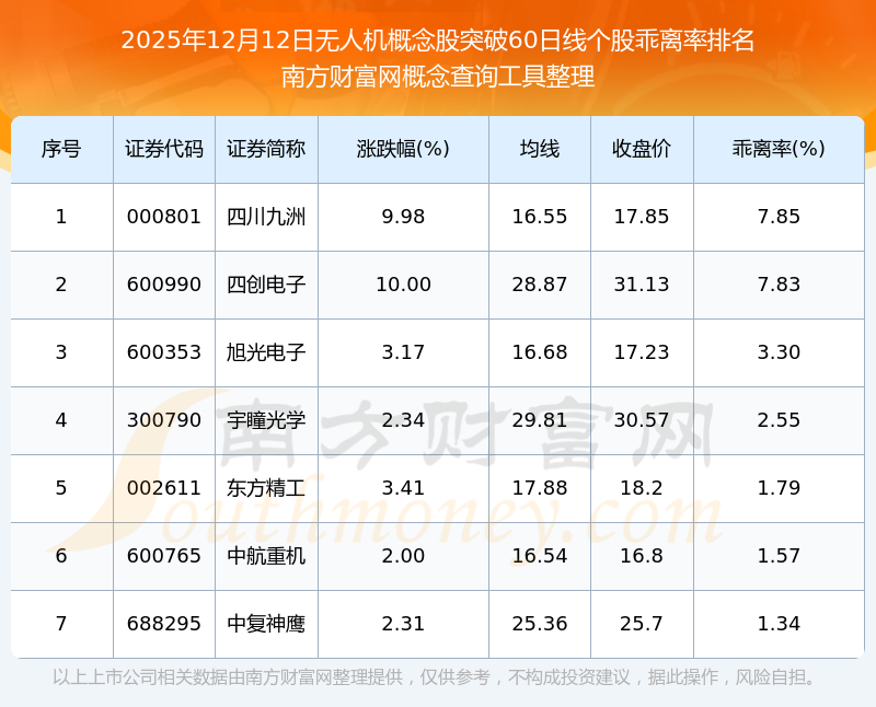 根據(jù)南方財富網(wǎng)概念查詢工具數(shù)據(jù)統(tǒng)計,截止2025年12月12日收盤,無人機概念股共有7只個股收盤價向上突破了60日線。其中乖離率較大的個股有四川九洲、四創(chuàng)電子、旭光電子等,乖離率分別為7.85%、7.83%、3.30%。