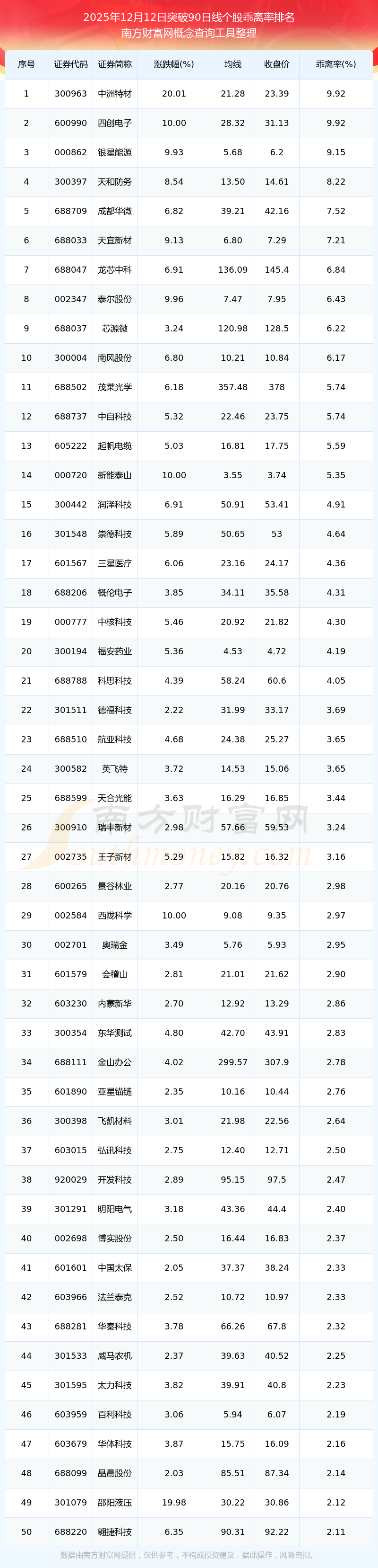 根據(jù)南方財富網(wǎng)概念查詢工具數(shù)據(jù)統(tǒng)計,截止2025年12月12日收盤,共有80只個股收盤價向上突破了90日線,其中乖離率較大的個股有中洲特材、四創(chuàng)電子、銀星能源、天和防務(wù)、成都華微等,乖離率分別為9.92%、9.92%、9.15%、8.22%、7.52%。