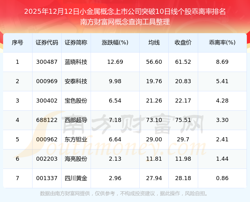 2025年12月12日小金屬概念上市公司突破10日線個(gè)股乖離率排名