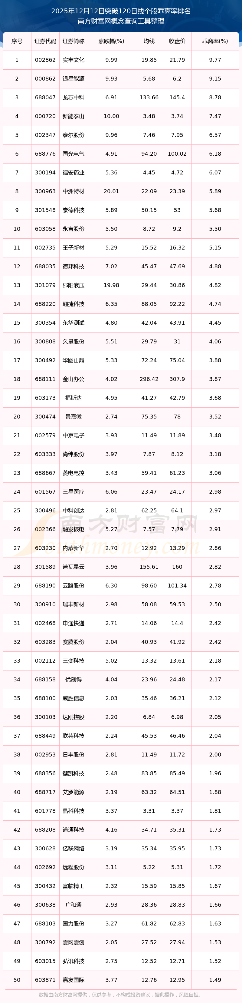 根據(jù)南方財(cái)富網(wǎng)概念查詢工具數(shù)據(jù)統(tǒng)計(jì),截止2025年12月12日收盤,共有75只個(gè)股收盤價(jià)向上突破了半年線,其中乖離率較大的個(gè)股有實(shí)豐文化、銀星能源、龍芯中科、新能泰山、泰爾股份等,乖離率分別為9.77%、9.15%、8.78%、7.47%、6.57%。