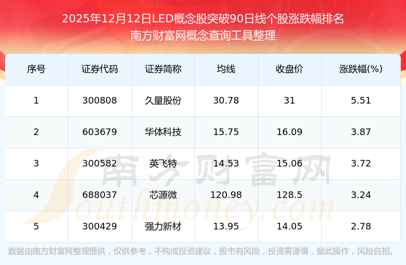 根據(jù)南方財(cái)富網(wǎng)概念查詢(xún)工具數(shù)據(jù)統(tǒng)計(jì),截止2025年12月12日收盤(pán),LED概念股共有5只個(gè)股收盤(pán)價(jià)向上突破了90日線。其中漲幅較大的個(gè)股有久量股份、華體科技、英飛特等,漲幅分別為5.51%、3.87%、3.72%。