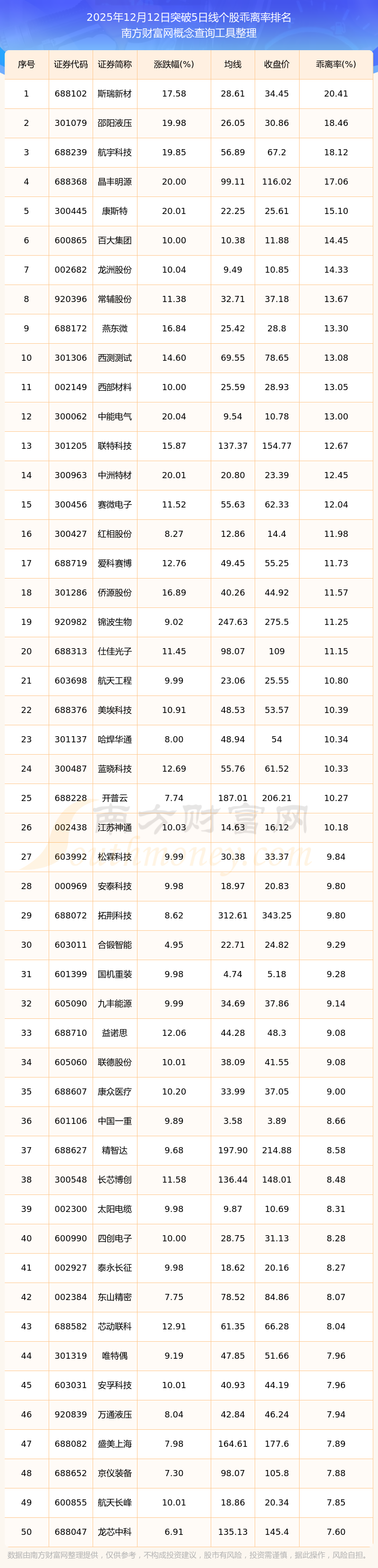 根據(jù)南方財(cái)富網(wǎng)概念查詢工具數(shù)據(jù)統(tǒng)計(jì),截止2025年12月12日收盤,共有404只個股收盤價(jià)向上突破了5日線,其中乖離率較大的個股有斯瑞新材、邵陽液壓、航宇科技、晶豐明源、康斯特等,乖離率分別為20.41%、18.46%、18.12%、17.06%、15.10%。