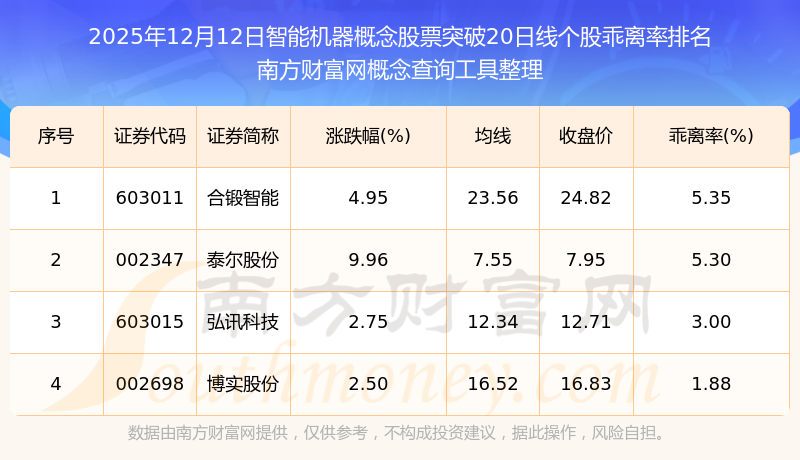 2025年12月12日智能機(jī)器概念股票突破20日線個(gè)股乖離率排名