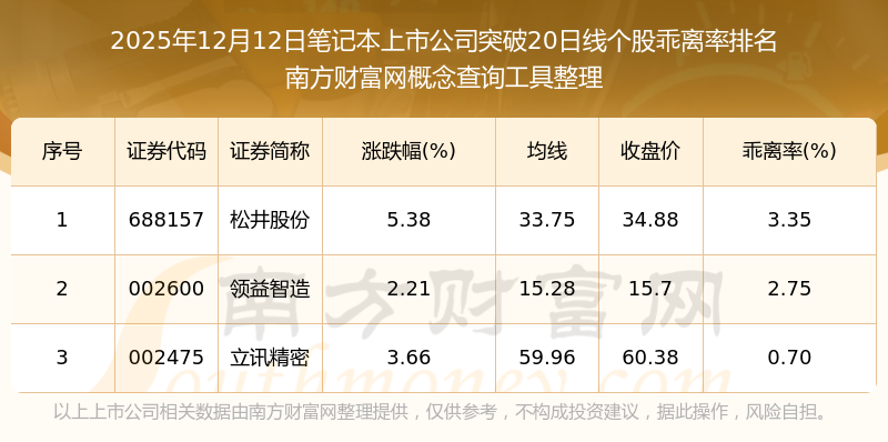 2025年12月12日筆記本上市公司突破20日線個(gè)股乖離率排名