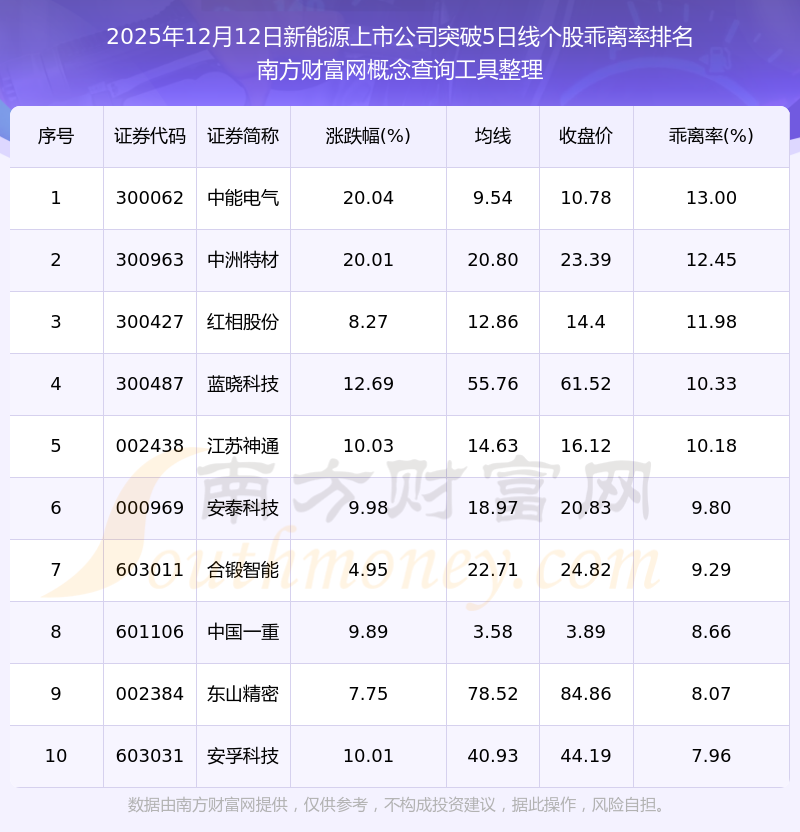 2025年12月12日新能源上市公司突破5日線個(gè)股乖離率排名