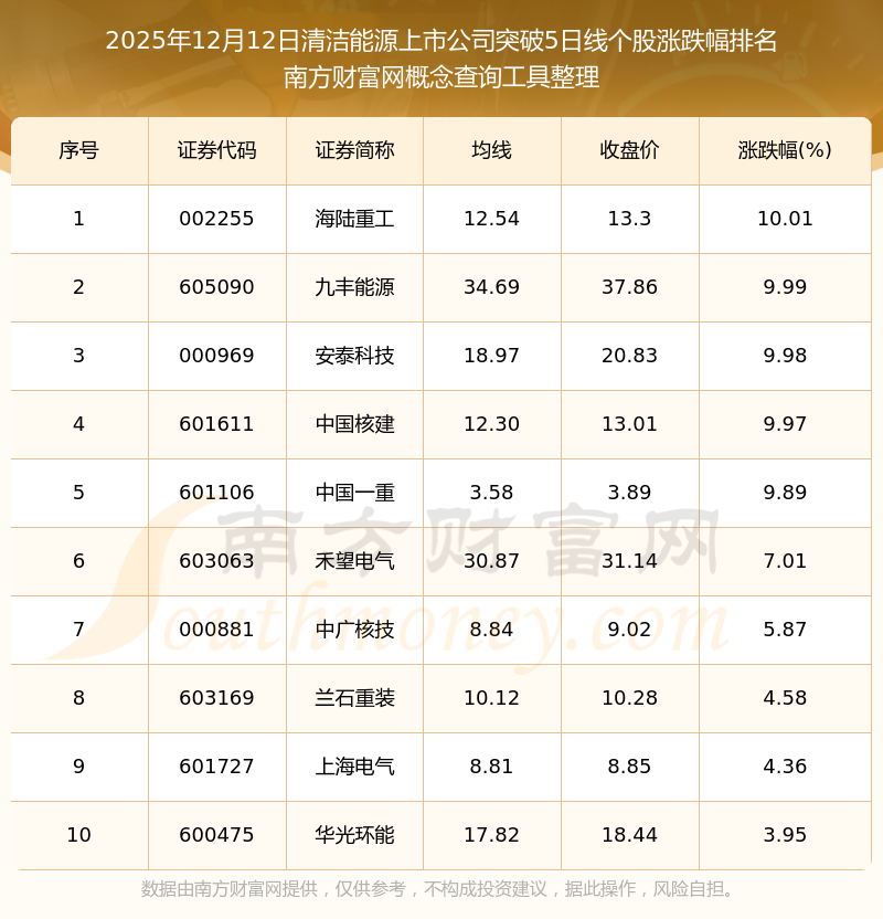 2025年12月12日清潔能源上市公司突破5日線個股漲跌幅排名