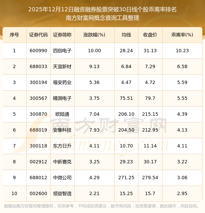 根據(jù)南方財(cái)富網(wǎng)概念查詢工具數(shù)據(jù)統(tǒng)計(jì),截止2025年12月12日收盤,融資融券股票共有29只個(gè)股收盤價(jià)向上突破了30日線。其中乖離率較大的個(gè)股有四創(chuàng)電子、天宜新材、福安藥業(yè)等,乖離率分別為10.23%、6.58%、5.59%。