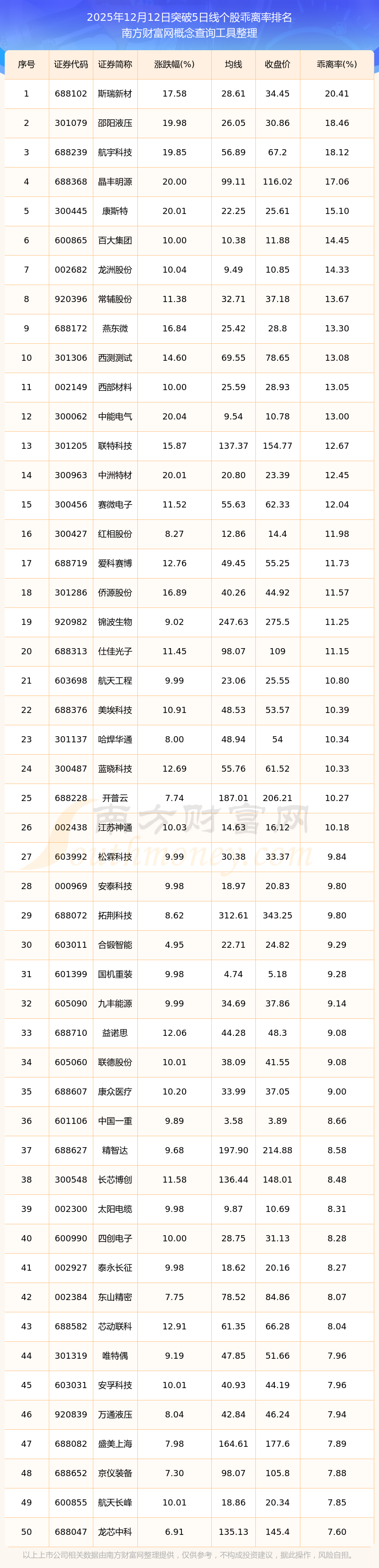 根據南方財富網概念查詢工具數據統計,截止2025年12月12日收盤,共有404只個股收盤價向上突破了5日線,其中乖離率較大的個股有斯瑞新材、邵陽液壓、航宇科技、晶豐明源、康斯特等,乖離率分別為20.41%、18.46%、18.12%、17.06%、15.10%。
