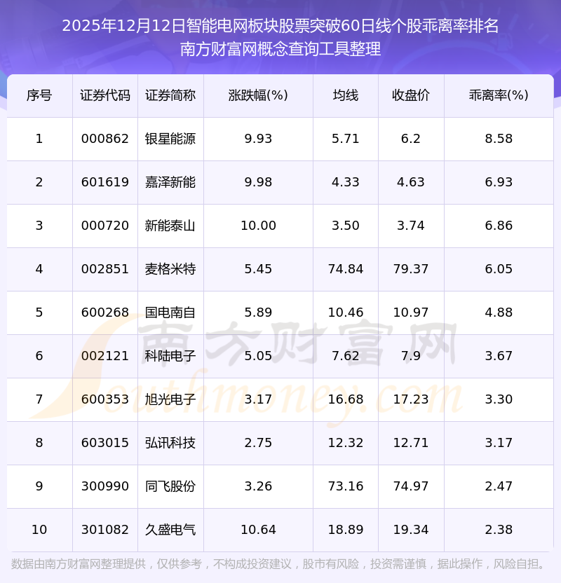 根據(jù)南方財(cái)富網(wǎng)概念查詢工具數(shù)據(jù)統(tǒng)計(jì),截止2025年12月12日收盤,智能電網(wǎng)板塊股票共有20只個(gè)股收盤價(jià)向上突破了60日線。其中乖離率較大的個(gè)股有銀星能源、嘉澤新能、新能泰山等,乖離率分別為8.58%、6.93%、6.86%。