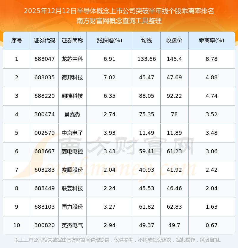 2025年12月12日半導(dǎo)體概念上市公司突破半年線個股乖離率排名