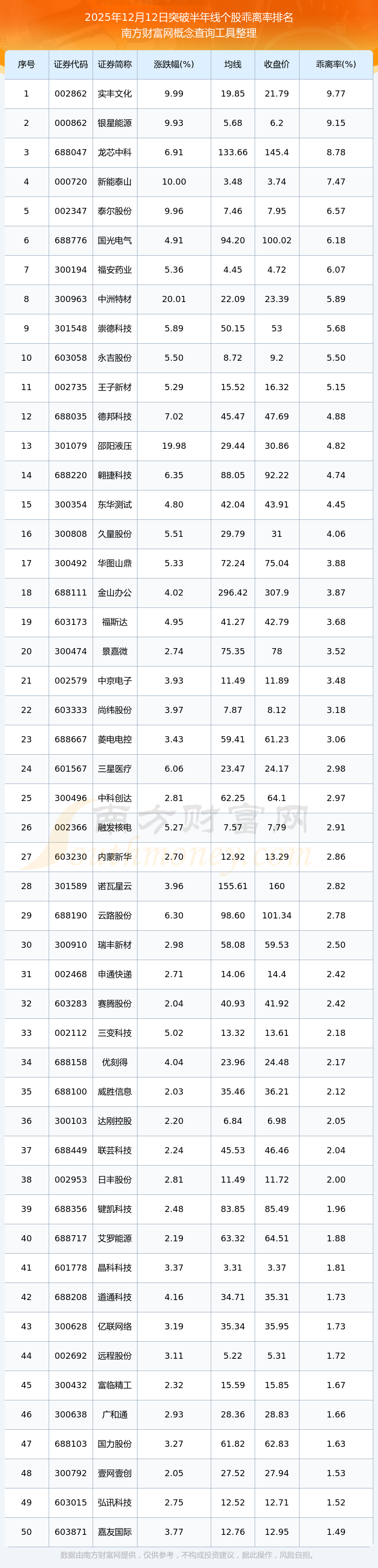 根據(jù)南方財富網(wǎng)概念查詢工具數(shù)據(jù)統(tǒng)計,截止2025年12月12日收盤,共有75只個股收盤價向上突破了120日線,其中乖離率較大的個股有實(shí)豐文化、銀星能源、龍芯中科、新能泰山、泰爾股份等,乖離率分別為9.77%、9.15%、8.78%、7.47%、6.57%。