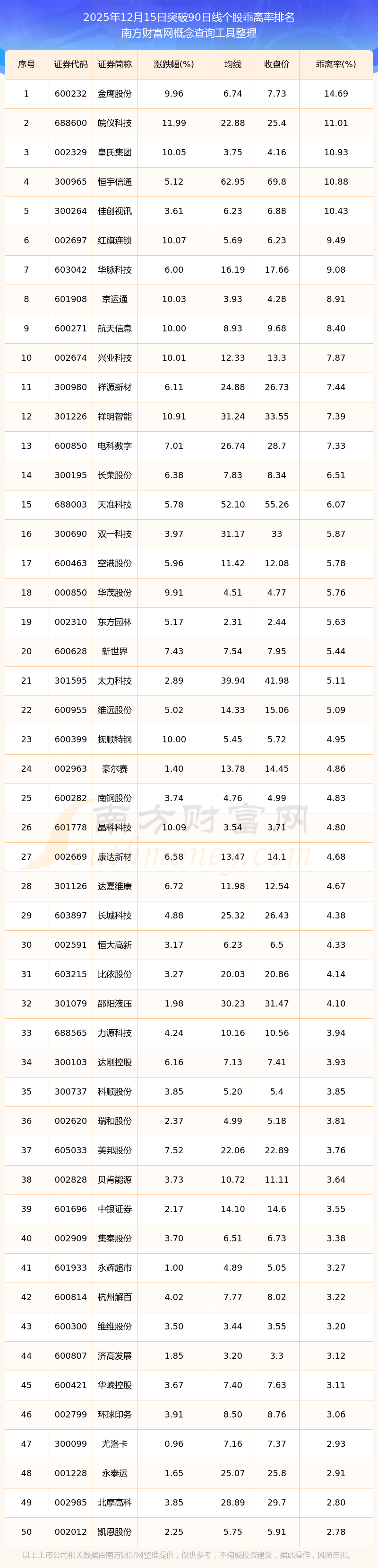 2025年12月15日突破90日線個(gè)股乖離率排名