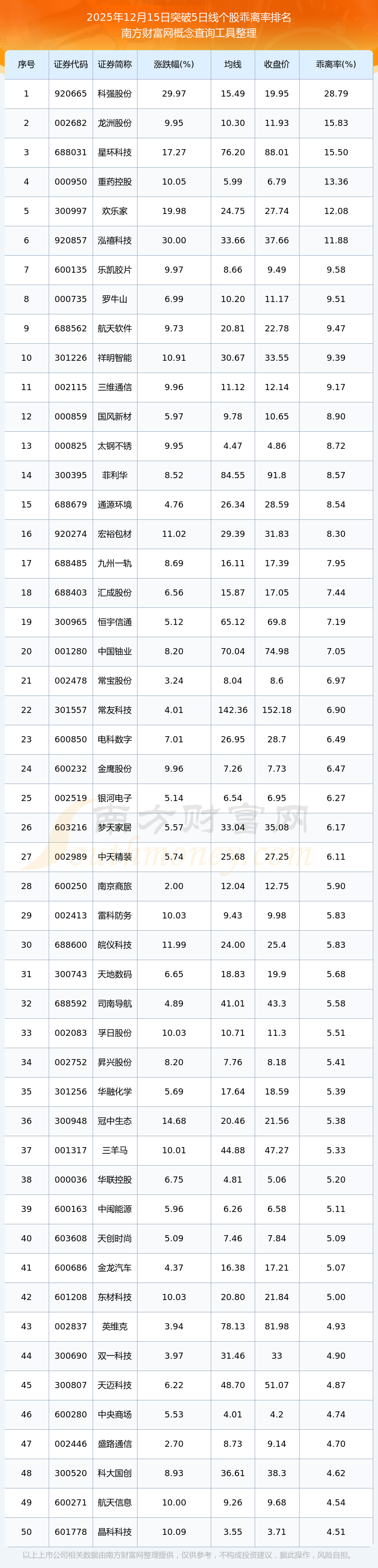 根據(jù)南方財富網(wǎng)概念查詢工具數(shù)據(jù)統(tǒng)計,截止2025年12月15日收盤,共有360只個股收盤價向上突破了5日線,其中乖離率較大的個股有科強股份、龍洲股份、星環(huán)科技、重藥控股、歡樂家等,乖離率分別為28.79%、15.83%、15.50%、13.36%、12.08%。