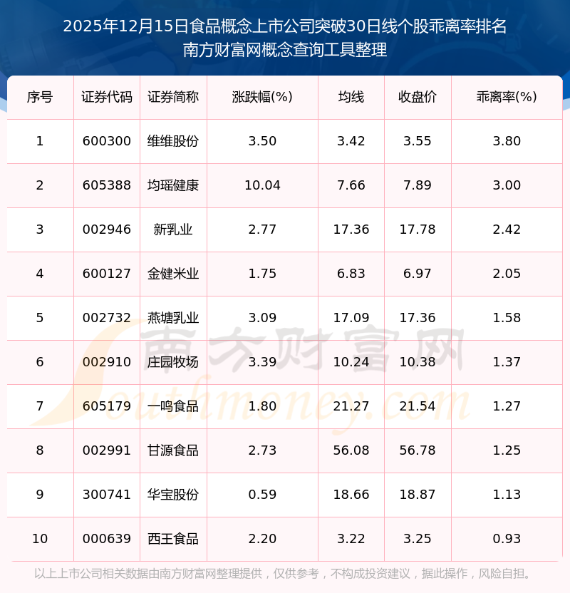 2025年12月15日食品概念上市公司突破30日線個(gè)股乖離率排名