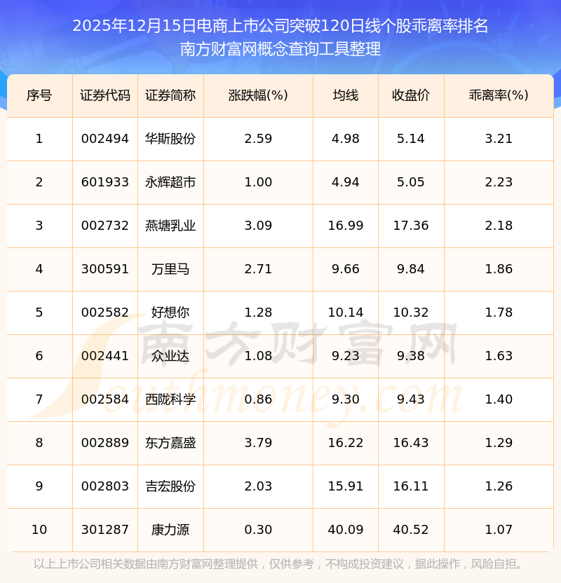 根據(jù)南方財(cái)富網(wǎng)概念查詢工具數(shù)據(jù)統(tǒng)計(jì),截止2025年12月15日收盤,電商上市公司共有17只個(gè)股收盤價(jià)向上突破了120日線。其中乖離率較大的個(gè)股有華斯股份、永輝超市、燕塘乳業(yè)等,乖離率分別為3.21%、2.23%、2.18%。