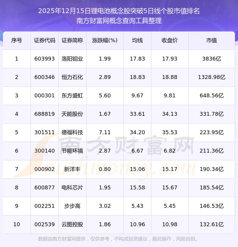 2025年12月15日鋰電池概念股突破5日線個股市值排名