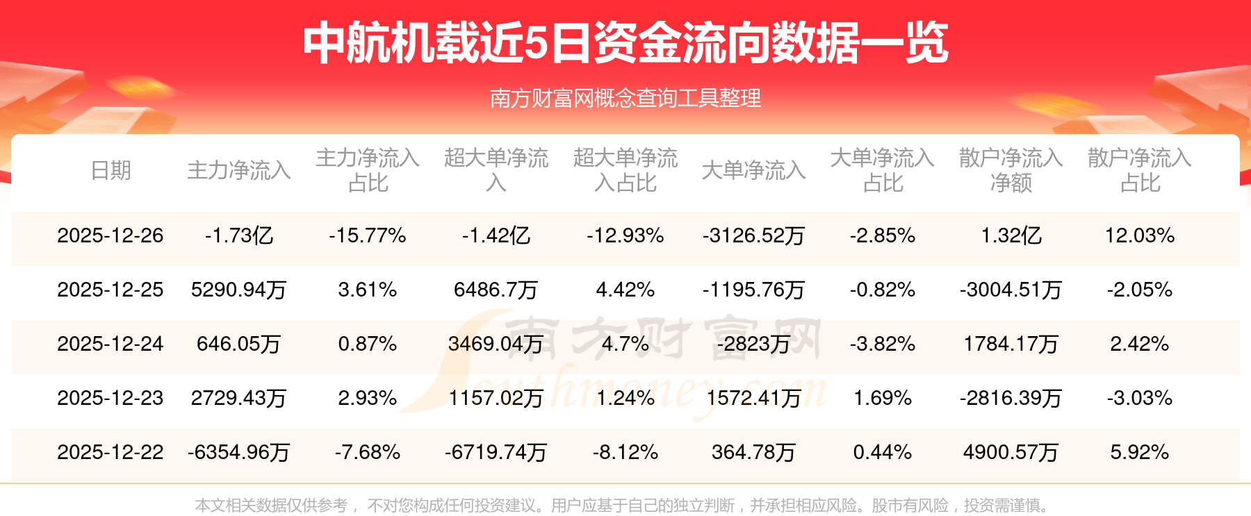 12月26日消息,中航機(jī)載12月26日主力資金凈流出1.73億元,超大單資金凈流出1.42億元,大單資金凈流出3126.52萬元,散戶資金凈流入1.32億元。