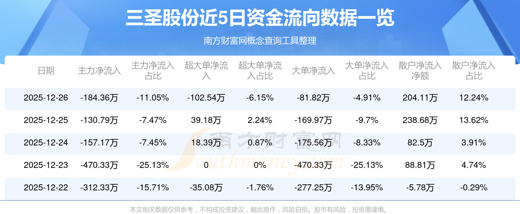 12月26日消息,ST三圣主力凈流出184.36萬元,超大單凈流出102.54萬元,散戶凈流入204.11萬元。